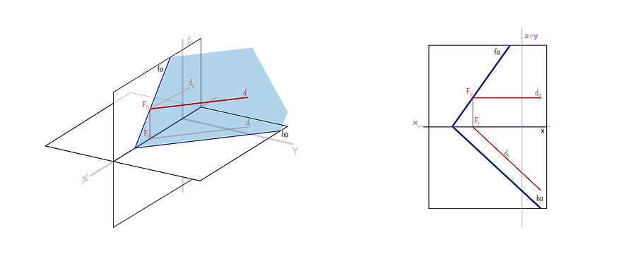 No papel, um plano é definido pelos seus traços nos planos de projecção horizontal (hα) e frontal (fα).